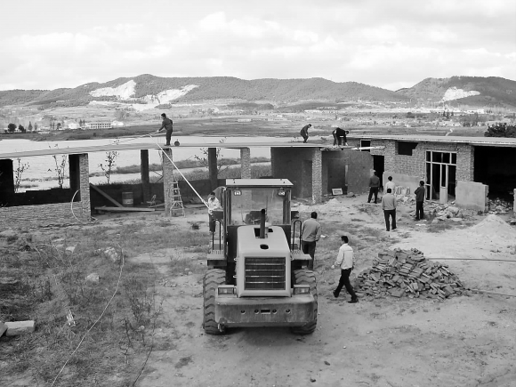 26日上午,威海市经区环保分局和崮山镇执法局共同拆除崮山水库边上一非法建设的养蘑菇大棚。图为工作人员在拆除现场。