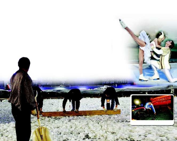 首演的是俄罗斯圣彼得堡国家冰上芭蕾舞团。据主办方介绍,大剧院首场演出制冰用的主机等大型器材全部从俄罗斯空运过来。在现场记者看到,制冰技术人员正忙碌着。