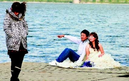 接连两日的寒潮令人们感受到了冬季的寒意。26日下午,在沂河西岸,在此拍摄婚纱照的新人们不惧寒冷,挑战低温。市民们却纷纷穿上了厚厚的棉服及长裤,与新人形成鲜明对比。当日,市区最低温度降至2℃,为入秋以来的最低。