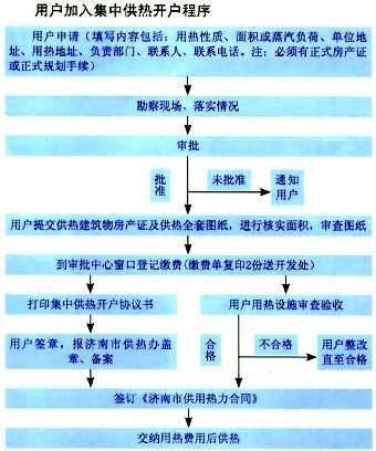 4.用户到济南市行政审批服务中心(黑虎泉北路187号)二楼市政公用事业局供热窗口领表并交纳管网建设费,供热企业相关工程公司按委托内容进行采暖施工。