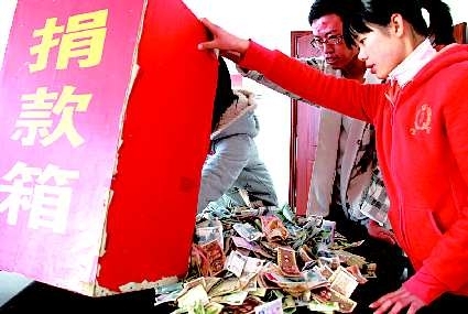 26日9时许,石油大学外国语学院07级4班的同学们就摆好了捐款箱。同学王晓慧说:“马群家里出事后就回临沂了,要强的他不愿让同学知道,在我们的劝说下才接受这次捐款。”