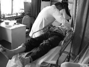 随后,记者来到海慈医院急诊外科,受伤的小伙子正躺在诊室的病床上,左腿膝盖处被划破,左脚也有出血现象,医生给他检查时问他哪里疼,他说哪里也不疼,只是努力睁大双眼,医生问姓名和家庭住址他都能流利回答,并告诉了他家和他姑家的电话,医生问他为什么跳桥,他默不作声。