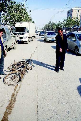 老栾在他的自行车前1米处,自行车车把歪斜。老郑说,之前他曾听到路上有异响传来,但当他发现老栾时,四周无车。