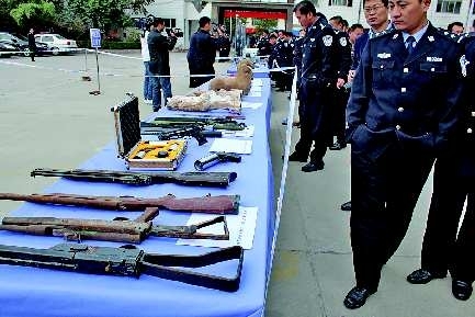 25日上午,济宁市公安局打黑除恶工作现场交流会在金乡县公安局召开。现场会上,金乡县公安局展示了自去年6月份以来打击黑恶犯罪中缴获的枪械、车辆等作案工具和高科技破案仪器,及追回的国家三级文物汉代陶器50余件。 本报记者 岳茵茵 通讯员 孙灵坤 摄影报道