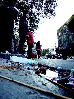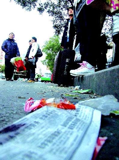 这一天,本报记者走上街头用镜头记录了没有环卫工的街景,发现不少路段上,都有路人随意丢弃的垃圾袋。城隍庙公交车站处,明明旁边就是垃圾桶,地上却积了好多垃圾(图①、②)。还有的地方垃圾溢出了垃圾箱,果皮、烟头、方便袋等撒落了一地。环卫工人早晨起来打扫得干干净净的街道,不少地方到了下午就已经垃圾成堆。