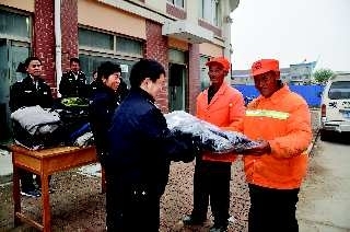 23日,临邑县城市管理和执法局开展了“我为环卫工人献爱心”活动,号召大家将自己的衣服捐献给环卫工。仅仅两天时间,就收到各类衣服373件。图为工作人员将捐献的衣服送到环卫工人手中。