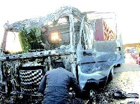 路政人员随即对车头部位进行灭火,并紧急封锁车道,联系了火警119。然而由于火势过旺,路政人员根本无法靠近。接警赶到的两辆消防车最后用了五六分钟才将货车的大火扑灭,而此时,车辆的两个前轮已经完全被烧化,车头也已经被大火烧成了空壳。