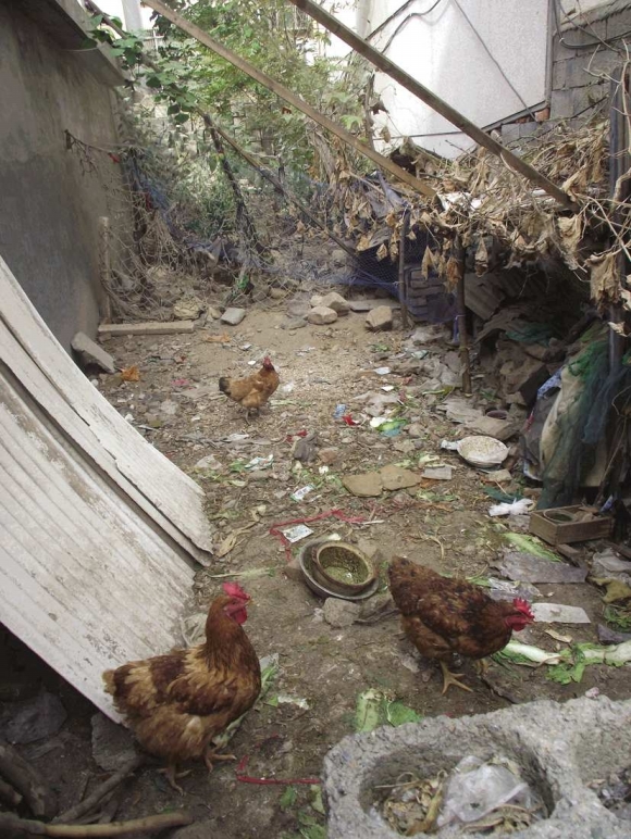 10月26日,记者在云海小区23号楼前发现,该楼储藏室和院墙之间的一块空闲地被人用砖垒了起来,墙内有一个用石棉瓦搭建的简易鸡棚,几只鸡正在鸡棚下面觅食,鸡舍内凌乱不堪。家住13号楼的居民李先生告诉记者,他们家和这个鸡棚仅一墙之隔,早上鸡打鸣的时候非常烦人。“几个月前就听说有人在这里养鸡,一开始还没注意,后来循着鸣叫声和臭味找了找,嗨,还真是养了鸡。”李先生苦笑着说。