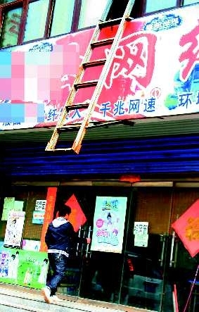 新纺街—家网吧在临街二楼窗口悬下—个钢梯,钢梯长约1.5米,底端离地面约2米。悬梯的上端用钢钉固定在二楼的临街窗口上。