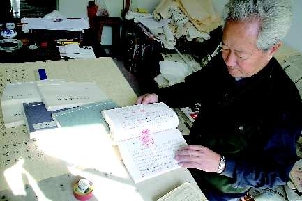1998年退休后,孙芝源老人有了充足的时间练习书法。2000年之后,老人决定用小楷抄写古书,竖版、繁体、线装,写成的作品跟原书惟妙惟肖,累计到现在已有七八本,约七十万字o老人今年73岁,他说他写字随兴,喜欢赵孟頫。21日,记者在楚毓社区采访了这位酷爱书法的老人o
