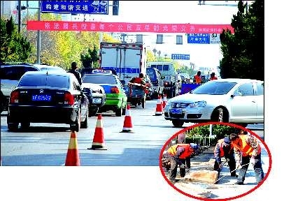 27日上午10时,府前街与胶州路交叉路口,由于府前街与东三路要进行大规模的整修,设了不少路障,出现了交通拥挤现象o据悉,该工程预计2011年4月底才能完工o