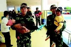 儿童福利院搬迁人手不够,潍坊某部队的32名武警官兵前来相助。这些20岁左右的小伙一路抱着孩子们小心翼翼,不少官兵戏称:“当了一路的奶爸”。