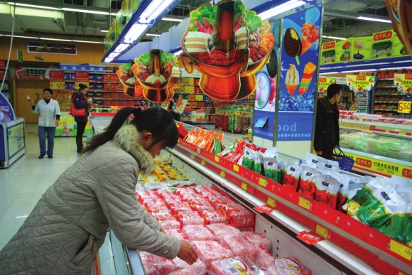 27日,在潍坊市佳乐家超市,市民正在选购火锅食品。随着天气越来越冷,火锅越来越受欢迎,超市也将火锅食品摆在了显眼的位置来吸引消费者。