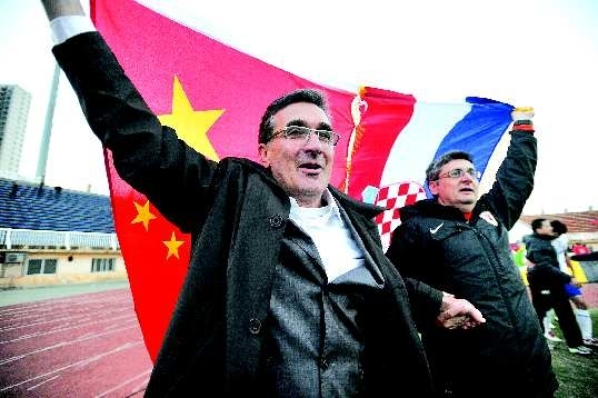 2010年10月27日,2010年中超第28轮,山东鲁能1:1南昌衡源,提前两轮夺冠。图为主教练伊万(左)手擎两国国旗庆祝夺冠。