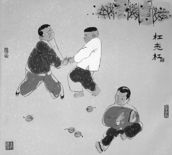 记得上小学时,每逢秋末,杨树叶子刮得满地都是时,好多男生的鞋里面,放着无数根杨树叶的柄,游戏时,两人从自己鞋中找一根粗而有韧性的杨树叶柄,济南叫老杠,用自己的老杠勾搭对方的老杠用劲拉,断者为输,孩子们视久战不断的“老杠”为宝贝,经常在小朋友面前从鞋里拿出来夸耀,这种游戏历史悠久,古代称“斗百草”,但这种鞋里藏老杠的游戏早已消失了。