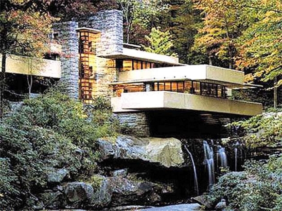 1934年,世界著名设计师莱特设计了一款凌空建于溪流和瀑布之上的别墅。在瀑布之上,赖特实现了“方山之宅”(houseonthemesa)的梦想,悬的楼板锚固在后面的和自然山石中。主要的一层几乎是一个完整的大房间,通过空间处理而形成相互流通的各种从属空间,并且有小梯与下面的水池联系。正面在窗台与天棚之间,是一金属窗框的大玻璃,虚实对比十分强烈。整个构思是大胆的,成为无与伦比的世界最著名的现代建筑。
