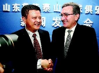 2009年12月16日,孙国宇(左)与鲁能泰山新帅伊万在新闻发布会上。(资料片) 本报记者 王鸿光 摄