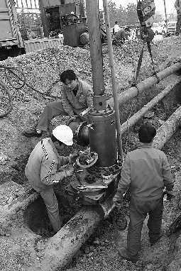 近日,位于北外环道路的燃气管线正式通气,实现了中石油、中石化两气源的相连,可储气约8000立方,并具有—定的调峰能力。图为济宁华润燃气公司员工对管道进行检测。本报记者刘守善 摄