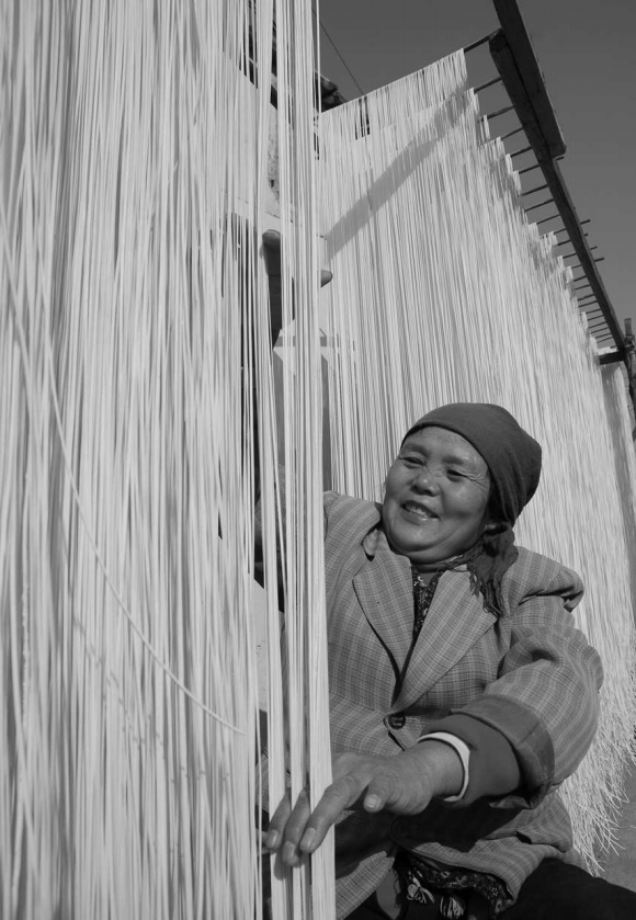 27日,泰山区王家庄村的鲁长英正在晾晒挂面。做了20多年挂面的鲁长英告诉记者,受面粉涨价影响,去年同期的挂面价格卖1.30元/斤,现在每斤要1.80元了。