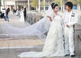 10月27日天气转暖,下午2时,美丽的东昌湖畔,20多对情侣扎堆拍婚纱照,成为—道靓丽的风景。