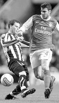 当地时间10月27日,阿森纳队球员法布雷加斯(右)在比赛中带球突破o当日,在2010—2011赛季英格兰联赛杯第四轮比赛中,阿森纳队客场以4:0战胜纽卡斯尔联队,晋级八强o 新华社供图