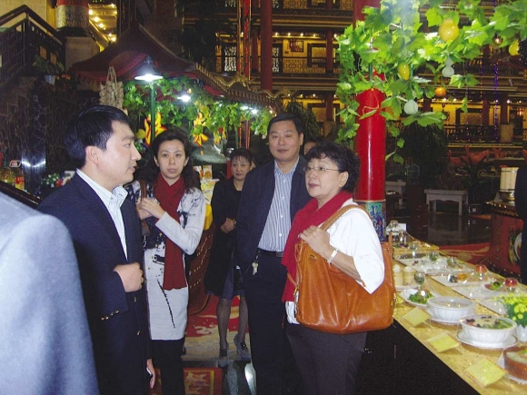 图为鱼翅皇宫大酒店总经理张龙(左一)陪同全国酒家酒店等级评定委员会主任张丽君(右一)、济南市商务局副局长张传林(右二)一行参观考察。