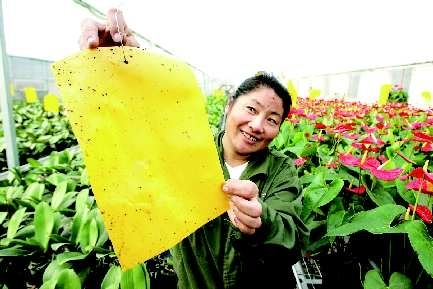 另外,从今年开始,大棚内首次使用了环保诱虫板,用以灭杀虫害。这种方法既环保节能,又节省了成本,一举两得。