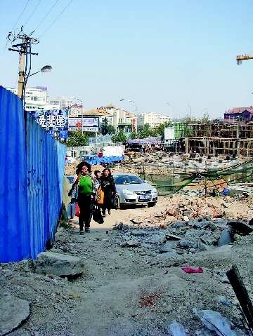 28日中午,记者赶到事发地点发现,与胶州路交汇的福建路路口已经成为一处建筑工地的入口,大门上面还写着“青岛温泉建设集团”字样,走进工地大门,原来平整的福建路路面也变得凹凸不平,上面胡乱堆放了砖头土块,几名老人小心翼翼迈过一处土方朝福建路16号小区走。