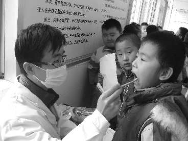 28日,在济宁市枣店阁中心小学,口腔医生正为孩子们进行口腔健康检查。为加强中小学生的爱牙意识,各中小学把口腔保健知识宣教列入教学日程,促进学生养成爱牙、护牙的好习惯。马文青 李均鹏摄影报道