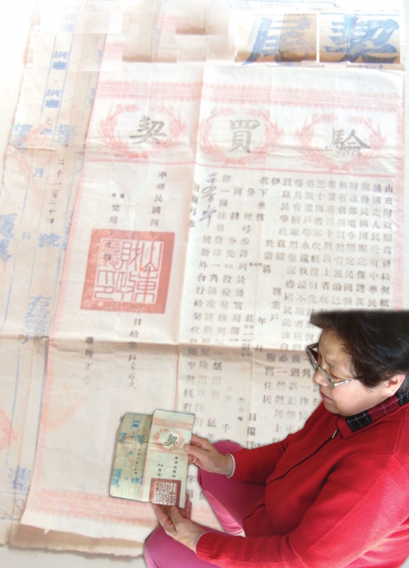 而—张土地房屋所有证因为特殊的历史背景而特别,上面写着“山东省按照中央人民政府内务部颁发之样式统—印制”,签发日期为1951年3月30日。上面有县长的签字,还刻有三个篆印,最大—个篆印可看出有“寿光县”字样,两个小的篆印,因为年代久远,印记模糊看不清楚。袁先生告诉记者,这是新中国成立之后土改之后发的土地房产所有证,家中—直保留着,传到现在自己手中。