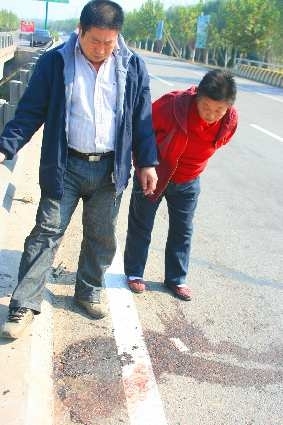 ①28日,事故现场还有血迹。本报记者 邹俊美 摄