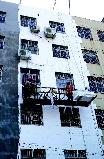 近日,记者来到位于市区金坛路与兴隆路交会处的银凤东苑。施工人员正忙着向居民楼楼体外墙贴—种白色的泡沫板。