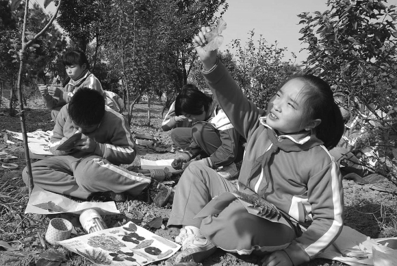 27日,泰山区王家庄小学学生们捡起落叶,在自由想象、动手创作中,创作出栩栩如生的落叶手工画,尽享拥抱大自然的快乐。图为学生们在校园里进行落叶创作。 本报记者刘丽 摄