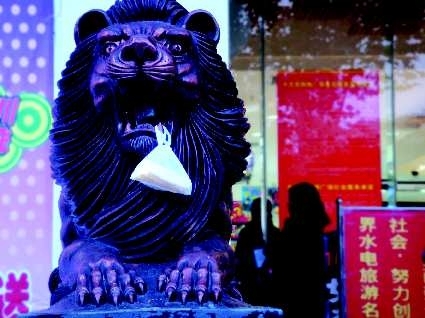 时间:2010年2月;地点:湖北省宜昌市某商场门前;自述:商场门前有一座狮子雕像,不知哪位顾客将手提袋挂在了狮子的獠牙上。狰狞的狮子仰天怒吼。点评:堪称史上最凶悍的“商场寄存处保管员”了。试想,有哪个小偷敢“狮口拔牙”呢?