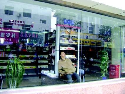 时间:2010年10月23日;地点:江都。自述:周末走上街头,路过一家新华书店门口,醒目的橱窗里一位老兄正襟酣睡。点评:嘴巴张得老大,哈拉子流了一地,是看书累的,还是仅仅占儿个位置蹭睡?