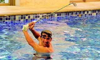 在泳池中的菲尔普斯开心地接过球杆,左手戴上了白色手套。“难道他要打高尔夫?”观众不禁猜测。果然,“飞鱼”游向泳池中央,慢慢把杆抬出水面,做了一个标准的高尔夫球开杆姿势。这一举动让现场掀起高潮,闪光灯、尖叫声充满了整个泳池。在连续挥杆七八次后,菲尔普斯结束了本次公开训练。毕竟在观澜湖高尔夫球场上挥杆,才是他此行的“正经事儿”。