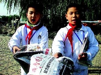 30日,趵突泉附近,来自纬二路小学的两位二年级小学生向行人推销报纸,他们说:“冬天到了,地震和泥石流灾区的小伙伴们需要棉衣取暖,我们要把卖报赚的钱捐给他们。” 本报记者周青先摄