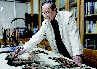 深秋时节,天高云淡。记者前去拜访王本诚先生。在他的画室里,一张巨大的画案占据了显著位置,上面摆满了笔墨纸砚,散发着淡淡的墨香。在山东画界,王本诚很早就以青绿、水墨山水著称,他的作品独具厚重、严整、练达的审美风格。他的笔下,峰峦峻拔而富于变化,石体坚凝,树木苍郁深秀,更兼清泉与流水。他笔下的山水又是人文化的。山水相连处,渔舟、飞鸟相与还,山脚处若隐若现的篱笆、窄窄的山间小径、几座小屋,那是山里人家。