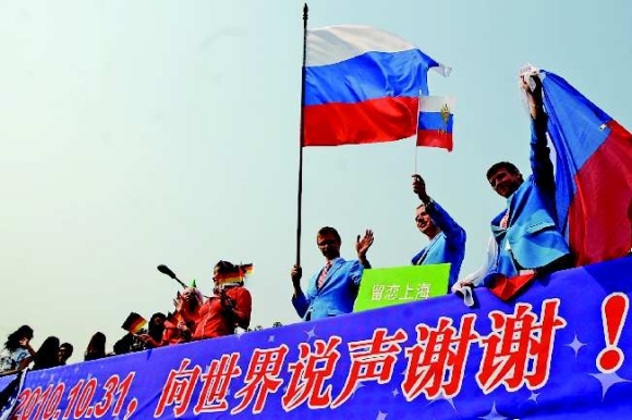 10月31日,上海世博会工作人员’参展方代表等—◇登上巡游花车表达对世博会的难忘之情o本报记者郭建政 摄