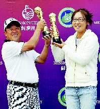 10月31日,中国香港明星曾志伟(左)和中华台北球手龚怡萍在颁奖仪式上捧起冠军奖杯o当日,观澜湖世界职业明星高尔夫球邀请赛闭幕,曾志伟和龚怡萍获得明星/职业球手配对赛冠军o 新华社记者 郭程 摄