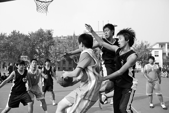 冠军,十三中则在女子组夺魁。图为古寨中学与大光华国际学校争夺初中男子组亚