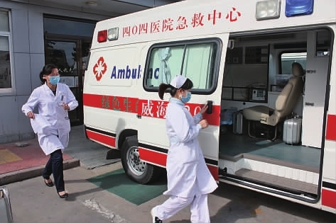 24日下午,404医院120急救中心接到急救电话,荣成人和镇一位101岁老人生命垂危,急需救护。挂断电话不到两分钟,急救中心徐建生主任与张护士就已经准备好救护物品登上救护车,而司机蒋师傅早已发动车辆。医护人员刚刚登上120救护车旋即驶出404医院。一路鸣笛,救护车驶往荣成人和。出发时记者看了一下表,13点35分,人和镇距离威海市区80多公里,蒋师傅说预计两点半能到目的地。