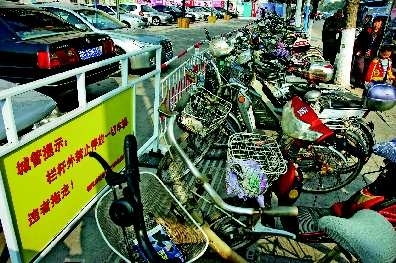 10月31日,在三八路银座门前的人行道上停满了自行车,路过的行人只好无奈地在行车道上行走。本报记者马志勇 摄影报道