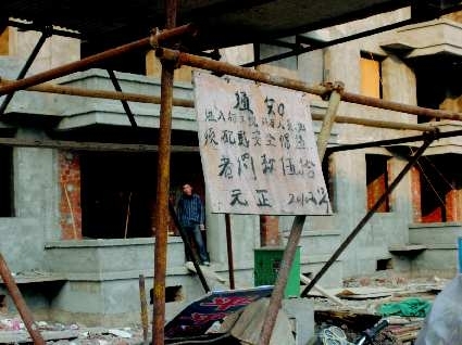 距离4号楼不远处,有一个警示牌挂在脚手架上,上面写着“进入施工现场所有人员必须配戴安全帽,违者罚款”等词语。但记者发现,这个警示牌附近,仍然有正在干活的工人没戴安全帽。