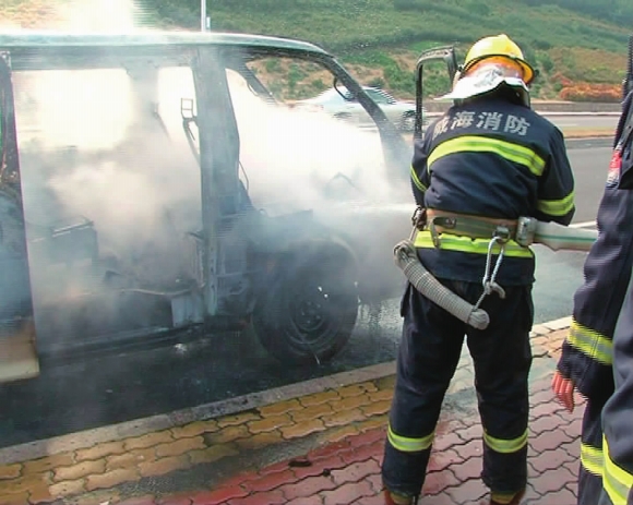 1日上午11时许,在309国道文登段,一辆行驶中的中型面包车自燃。就在10月31日中午,初张路崖东头路段也发生一起车辆自燃事故,一辆装载煤灰的大罐车在行驶中两侧轮胎着火。图为文登消防大队扑救自燃的面包车。本报记者 陶相银 通讯员 赵磊 刘航 摄