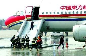 下图:在青岛流亭国际机场演练现场,—架客机迫降时偏出跑道,飞机起火受损,救援人员迅速展开急救o本报记者杨宁 尉伟通讯员 张超 摄影报道