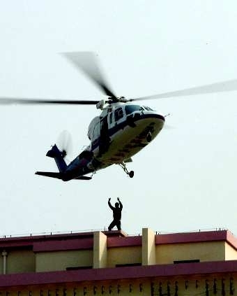 右图:在青岛消防训练基地演练现场,直升机正在对被困高层的人员实施救援o