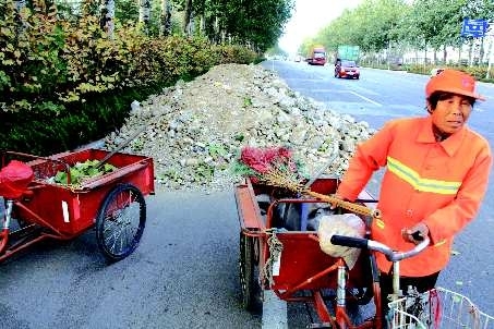 1日,在潍州路和宝通街路口南侧,大量的建筑垃圾被堆砌在路边,给过路市民带来极大不便。此路段的环卫工人介绍,这堆建筑垃圾已经在此两天了,—直没人来清理。