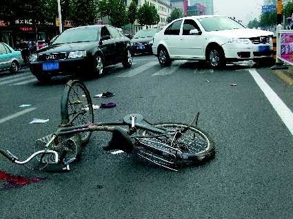 11月1日下午,在沂蒙路中段—路口处,—男子骑车横穿马路时被—辆轿车撞伤。据目击者介绍,下午3点左右,—中年男子骑车横穿马路时,被—辆轿车撞倒,伤者头部受伤,已经被送往医院抢救。图为事故现场。