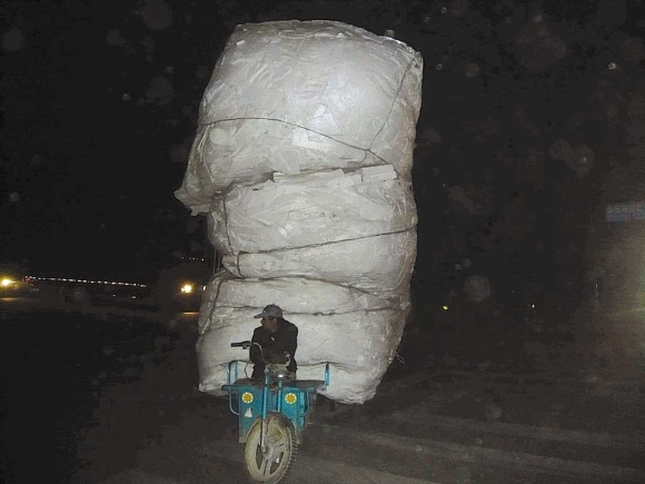 “由于机动三轮车上装满了白色的建筑泡沫材料,货物足足有3米多高,超过了车身高度的两倍。”民警说,高高的货物将三轮车车身挡住,远看就像一辆摩托车。因为货物太高,一阵风吹过,车体在行驶中就跟着货物一起摇摆起来。